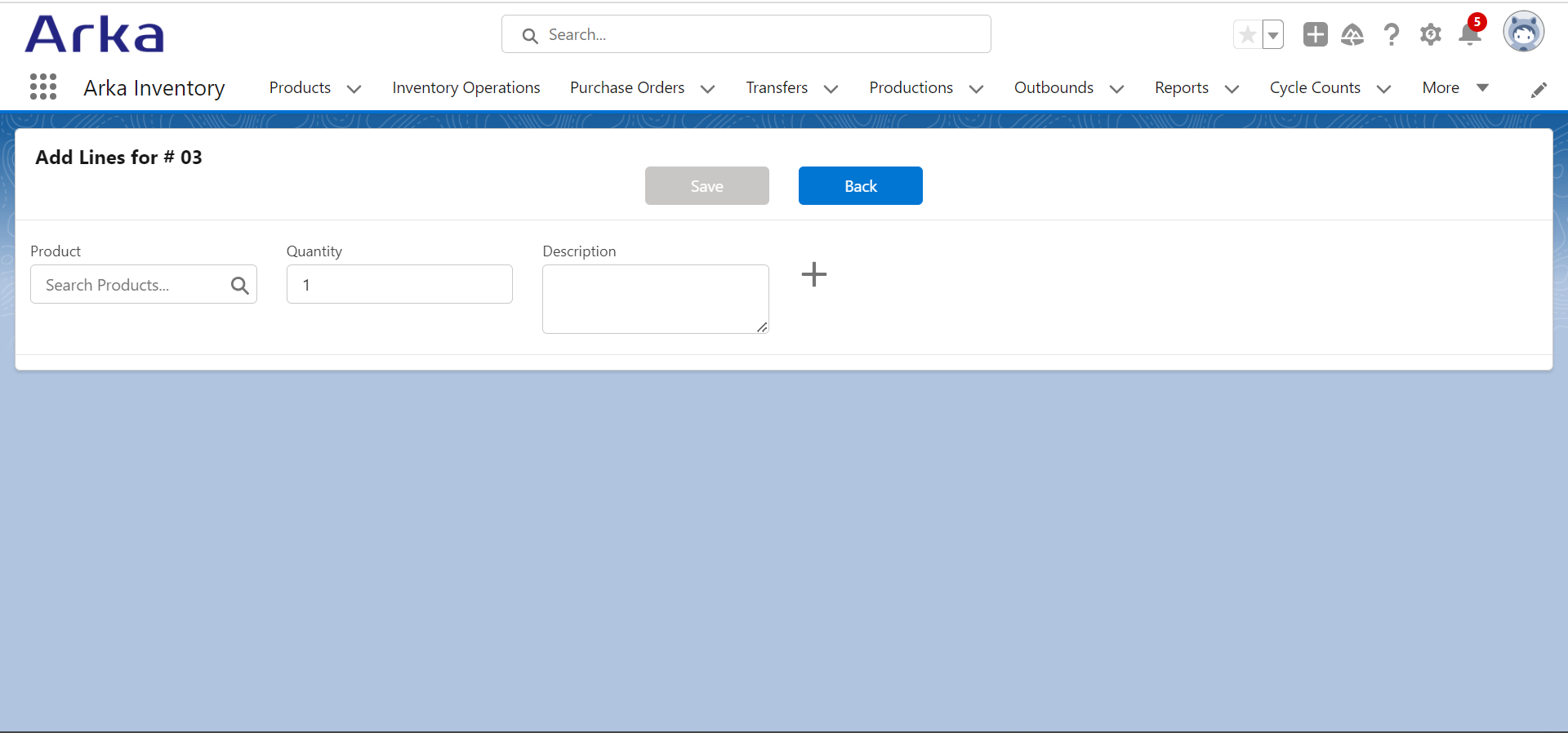 In that line Items, provide the Product, Quantity, and Description. and Click "+" to Add a line Item